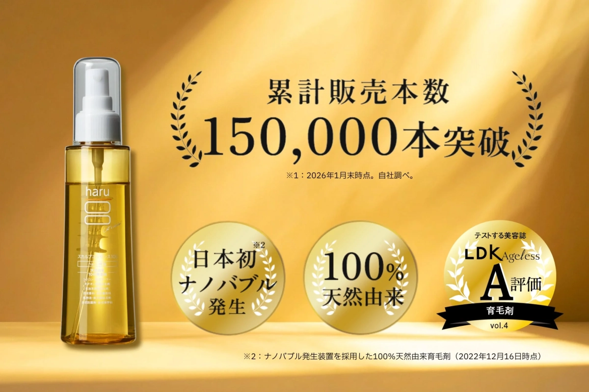 ヘッドビューティブランド「haru」は、リンス不要のオールインワンシャンプー「kurokamiスカルプ(haruシャンプー)」で有名。シリーズ累計出荷本数800万本(2025年10月時点メーカー出荷実績)を突破したロングセラー商品です。