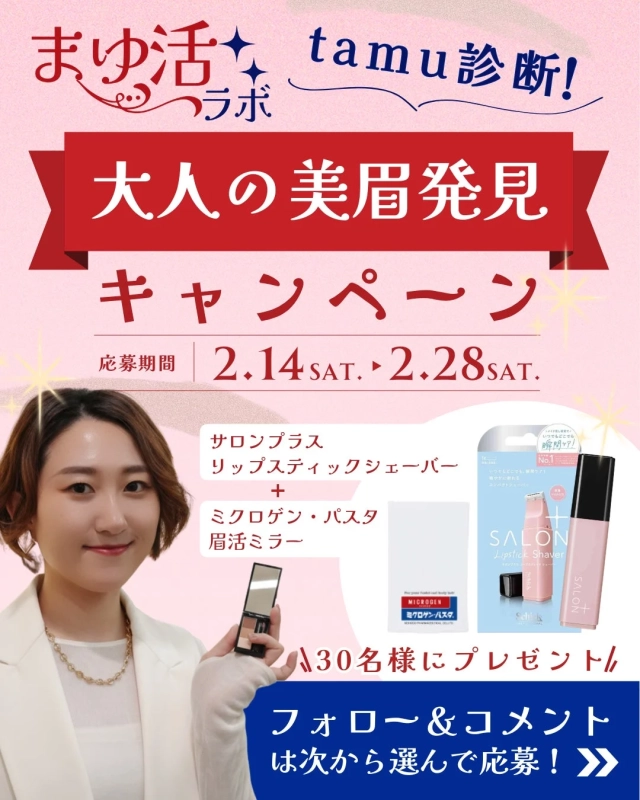 キャンペーン期間中、ミクロゲン・パスタの公式Instagramアカウント(@microgen_pastae)をフォローし、キャンペーン投稿に「眉のお悩みテーマ」をコメントすると、抽選で30名に「サロンプラスリップスティックシェーバー+ミクロゲン・パスタ眉活ミラー」がプレゼントされます。