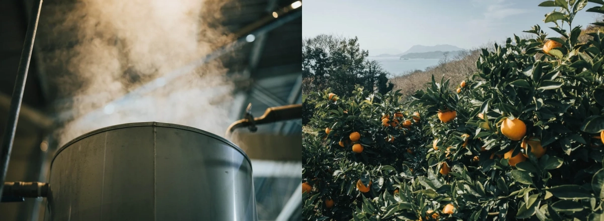 尾道蒸留所では、400Lの大型蒸留器を導入。これにより、果皮がフレッシュな状態のまま大量に蒸留することが可能になりました。高い機能性を持つ精油の安定供給と、地域産業の活性化の両方を目指しています。