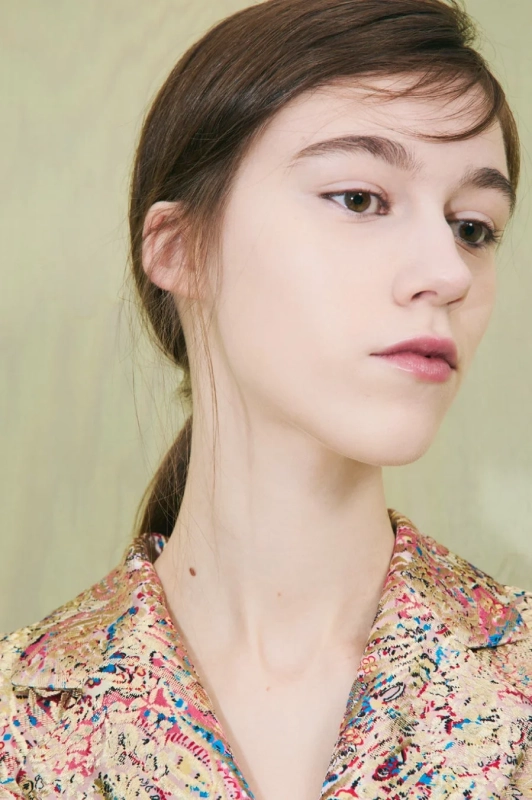 ヘアスタイルは、サイドパートの無造作なポニーテールで、すっきりとしつつも抜け感のある雰囲気に仕上げられています。