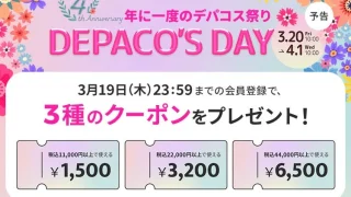 大丸・松坂屋のコスメオンラインストアDEPACOが、4周年を記念して「DEPACO'S DAY」を3月20日から開催します。お得なクーポンや限定アイテム、SNSキャンペーンなど、デパコス好きにはたまらない企画が盛りだくさんです!